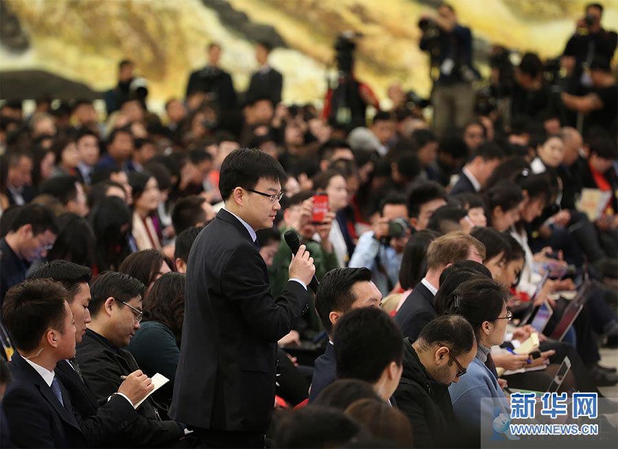 3月20日,十三届全国人大一次会议在北京人民大会堂举行记者会,国务院总理李克强应大会发言人张业遂的邀请会见中外记者,并回答记者提问。国务院副总理韩正、孙春兰、胡春华、刘鹤参加。这是记者在提问。新华社记者 金立旺 摄