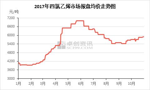 2017年1-10月份国内四氯乙烯价格整体走势较2016年无异,仍是呈现“n”字形,但与2016年不同的是,2017年国内四氯乙烯价格受制冷剂R125市场运行转强的影响,市场成交气氛表现十分乐观,整体走势上行。根据卓创资讯数据显示,2017年1-10月份四氯乙烯厂家挂牌均价在5537.83元/吨,较去年同期4618.8元/吨的价格上涨919.03元/吨,涨幅在19.89%。年内企业挂牌均价高价在7000元/吨,出现在6月份;z*i低价在5000元/吨,出现在2月份,高低价相差高达2000元/吨。