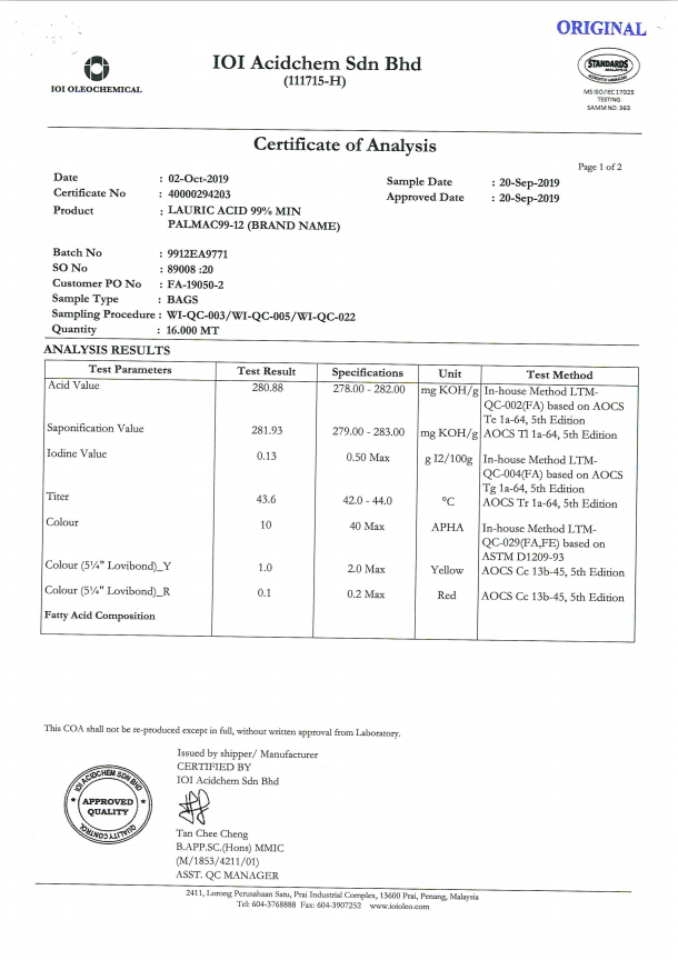 产品型号马来西亚椰树牌 月桂酸(十二酸)