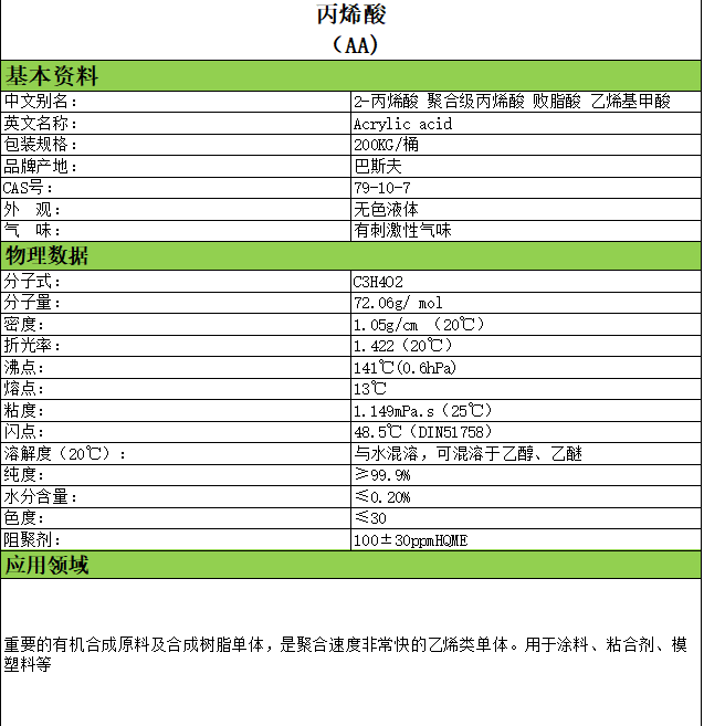 丙烯酸酯类丙烯酸(AA) 产品资料下载列表: