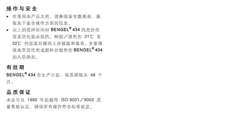 树脂/溶剂在21℃~32℃的温度对BENGEL®434的润湿效率有帮助。并要确保表面活性剂或颜料分散剂在BENGEL®434加入后添加,若使用回转球磨机或卵石球磨机,树脂/溶剂;BENGEL®434及化学活化剂须在研磨机混合5-10分钟,然后才加入颜料及表面活性剂。
