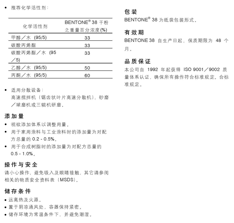 BENTONER 38为一适用于低至中极性有机溶剂涂料体系的有机膨润土添加剂。