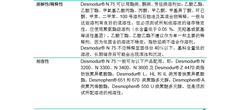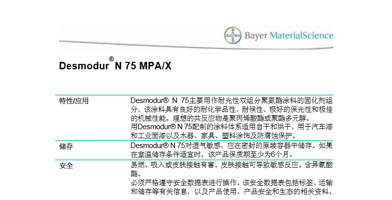 固化剂N75主要用作耐光性双组分聚氨酯涂料有固化剂组分,该涂料具有良好的耐化学品性、耐候性、极好的和 的机械性能。理想的共反应物是聚丙烯酸或聚酯多元醇。