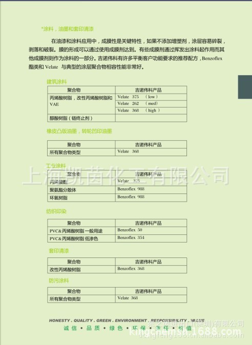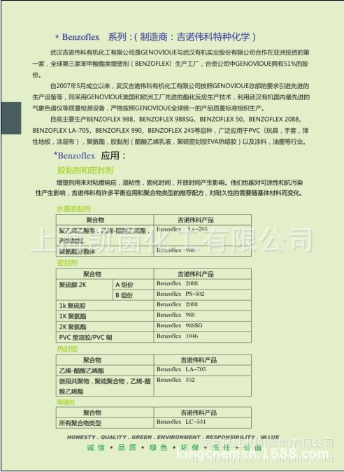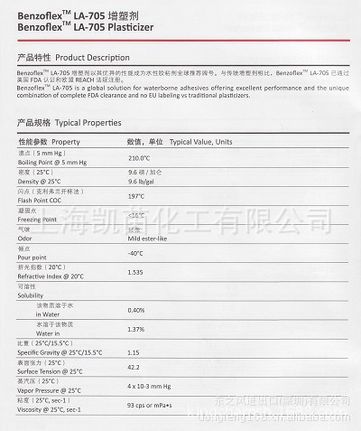 产品特性:专为水性胶粘剂行业特别配制的苯甲酸酯类增塑剂,以其优异的性能成为水性胶黏剂全球推荐牌号。