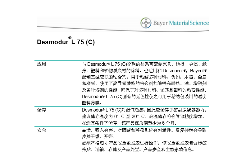 也适用和Desmocoll,Baycoll配制室温交联的粘合剂。用于粘结多种材料,例如,木器、金属和塑料。