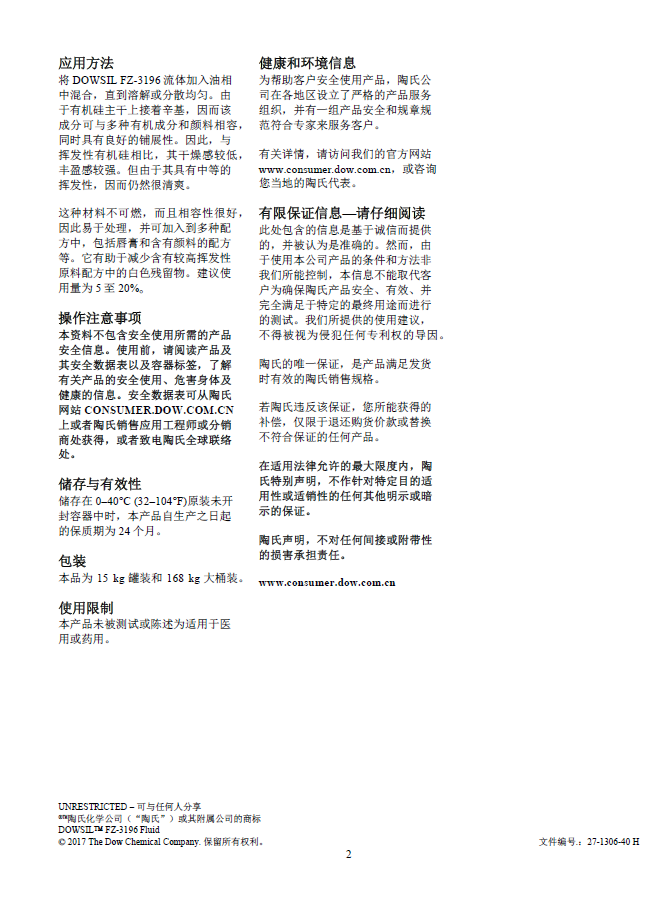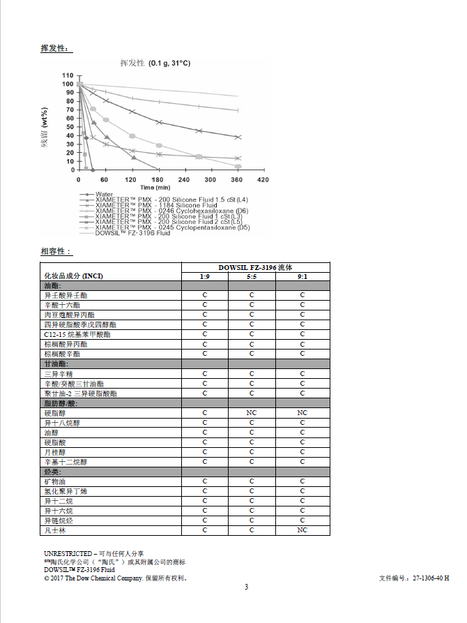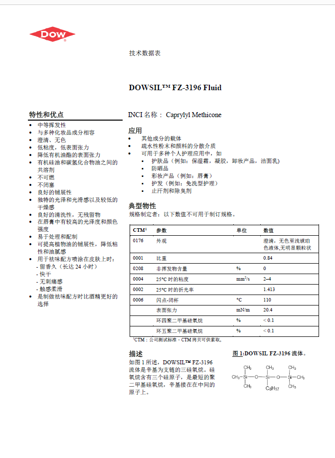 产品型号道康宁(DOW) FZ-3196 特种硅油化妆品硅油