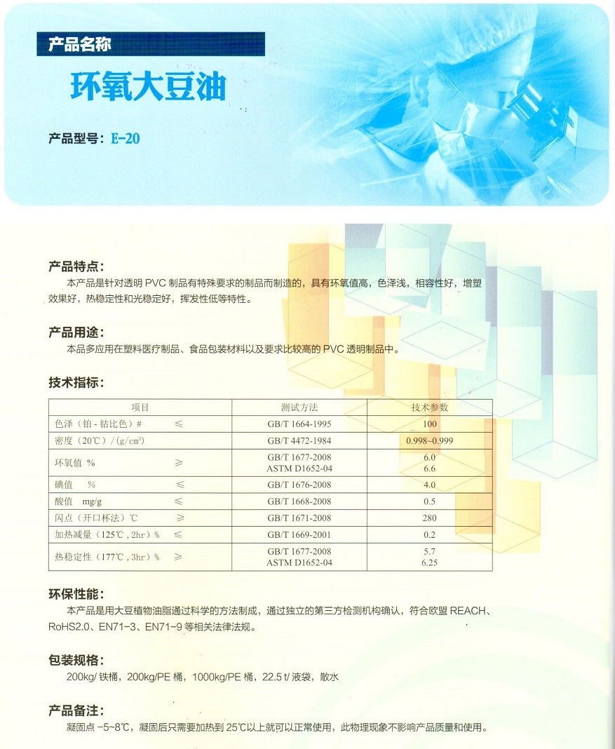 产品特点:E-20是针对透明PVC制品有特殊要求的制品而制造的,具有环氧值高,色泽浅,相容性好,增塑效果好,热稳定性和光稳定性好,挥发性低等特性。