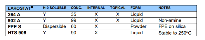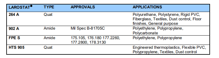 巴斯夫可以提供完整的抗静电剂产品,包括季铵盐类(larostat®264 A)和烷醇酰胺(Larostat®902和Larostat®FPE-S)。