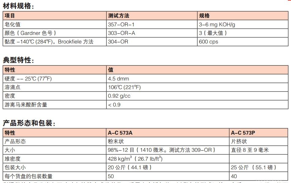 霍尼韦尔A-C573p是基于世界先进的接枝工艺,所以具有热稳定性能和康氧化性优异的特点,在纸箱涂料和色母粒行业应用比较广泛。