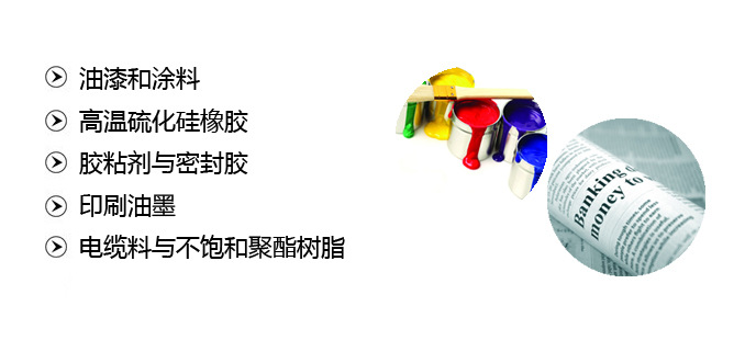 应用:油漆和涂料、HTV高温硫化硅橡胶与液体硅橡胶、胶粘剂与密封胶、印刷油墨、电缆料与不饱和聚酯树脂