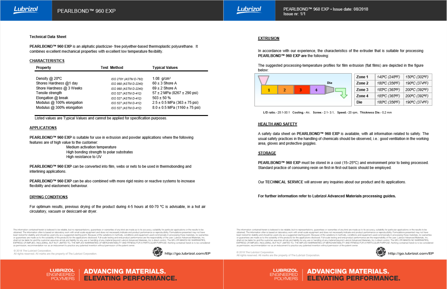 产品型号路博润TPU PEARLBOND™ 960 EXP
