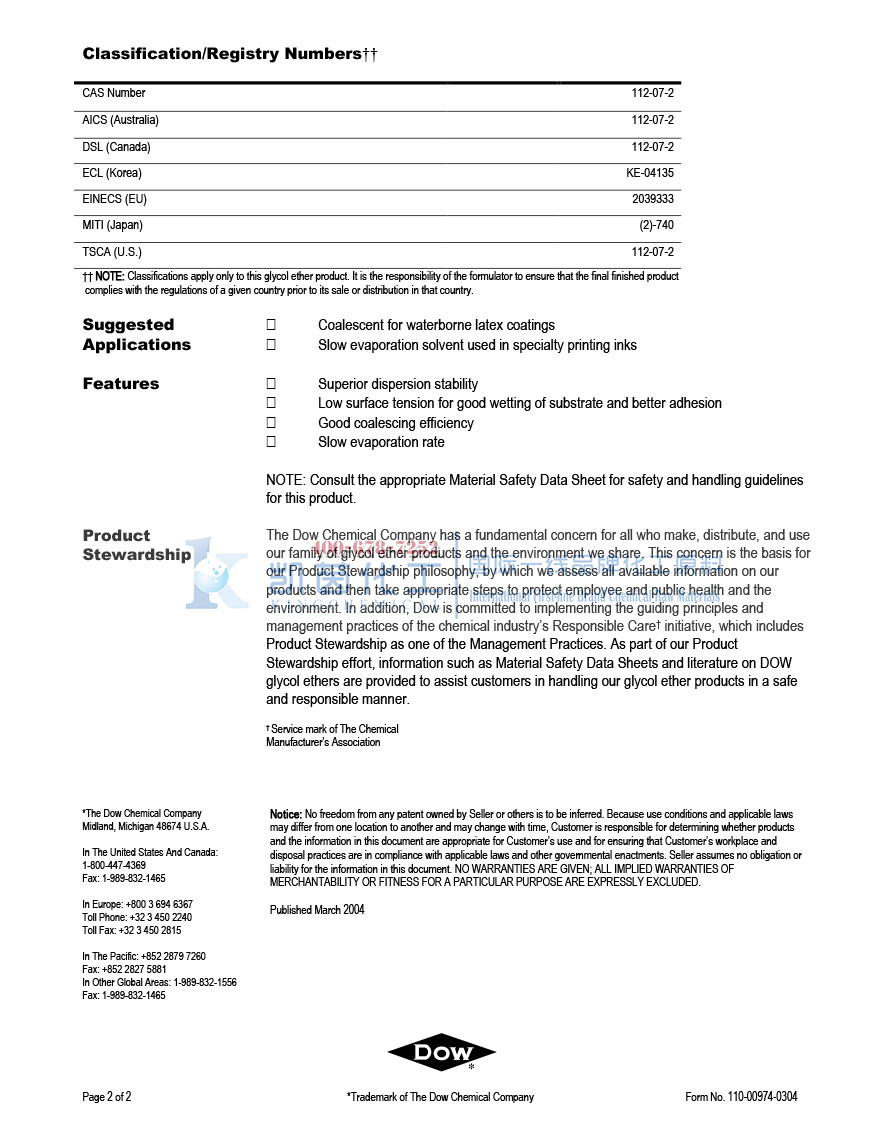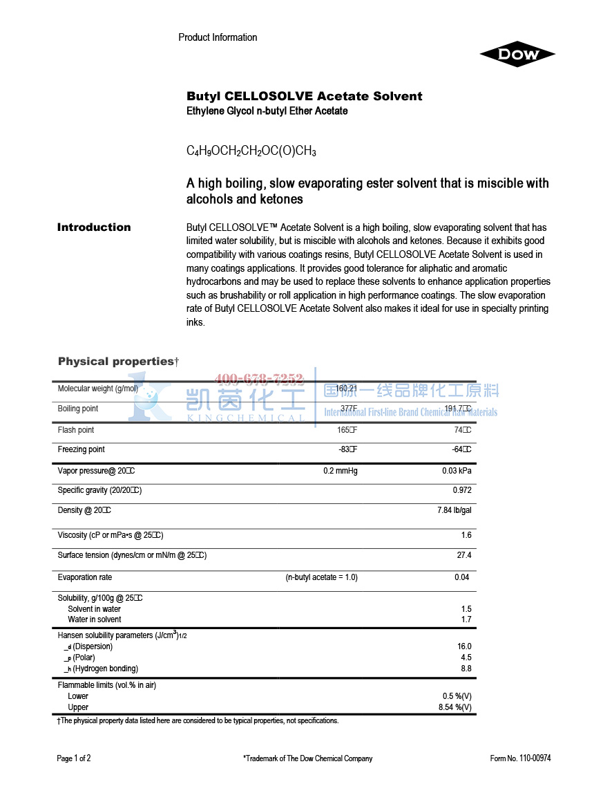 产品型号美国陶氏DOW乙二醇丁醚醋酸酯BCSAC(CAS号:112-07-2)