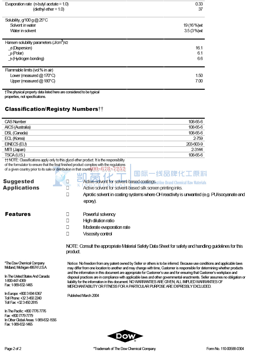 产品型号美国陶氏DOW丙二醇甲醚醋酸酯PMA(CAS号 108-65-6)