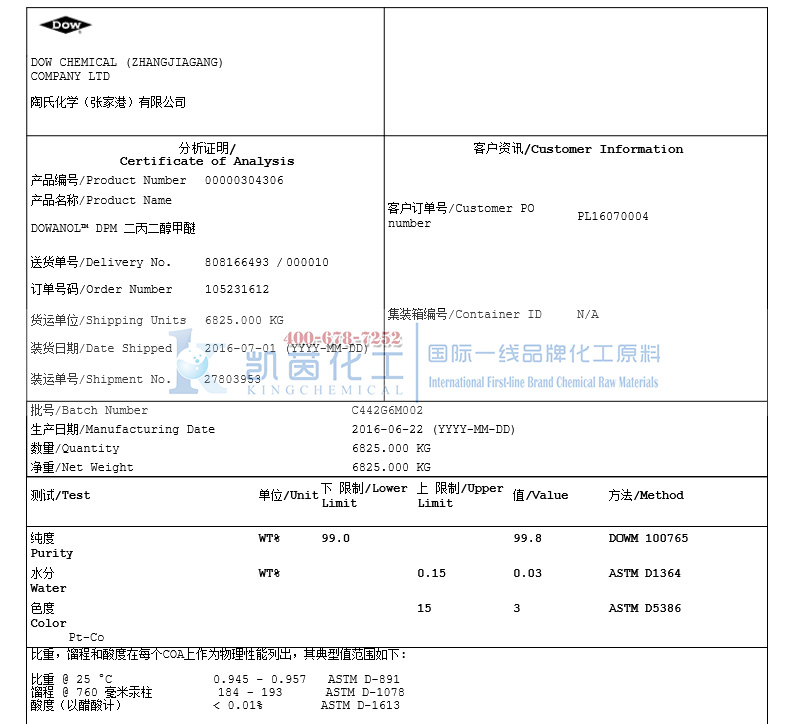 产品型号美国陶氏DOW二丙二醇甲醚DPM(CAS号:34590-94-8)