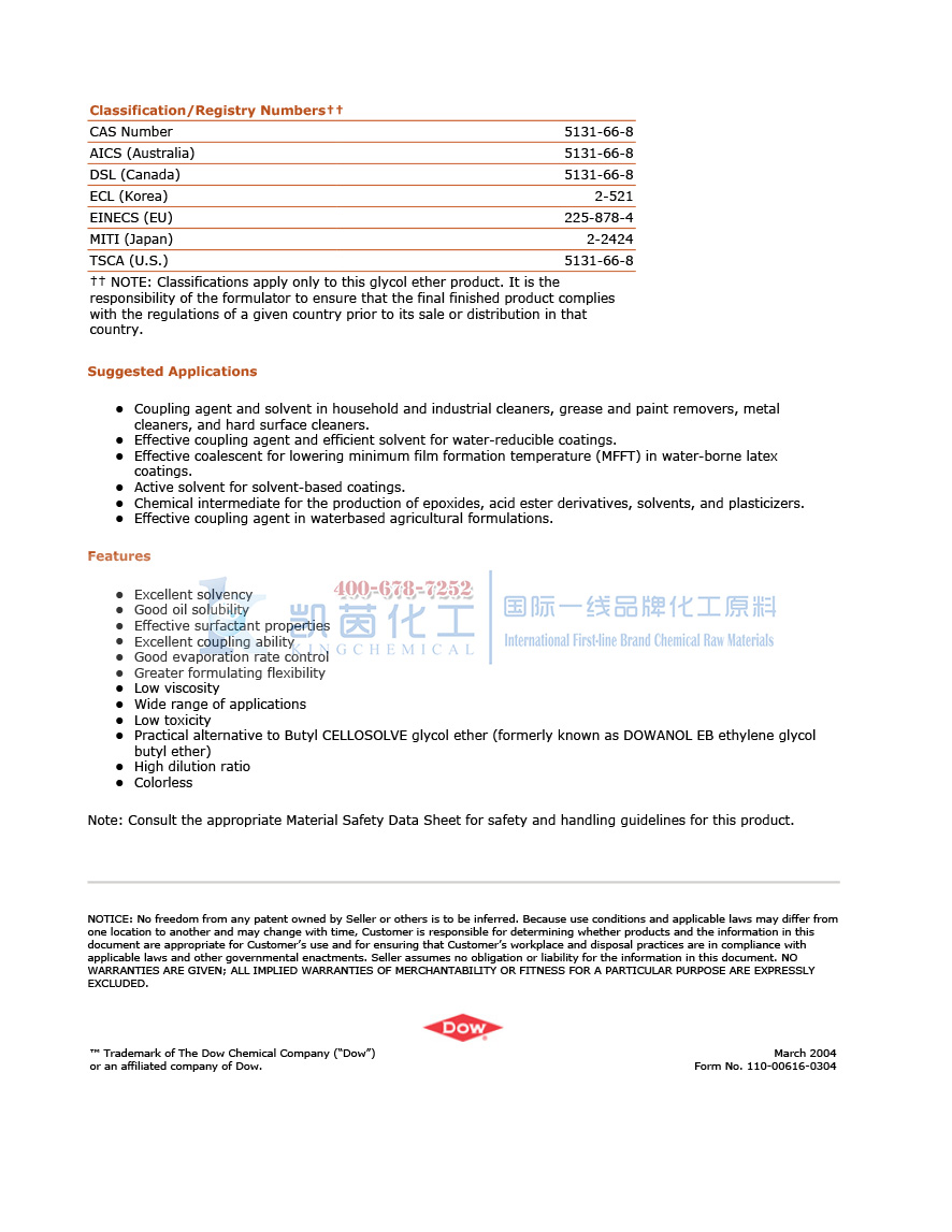 产品特性:由于其极低的毒性,较悦人的气味,是很有前途的环保型溶剂。用于工业/家用清洁剂配方中,安全性极高,为许多发达国家,特别是日本所认可。又因其HLB值接近于水/油之中间,在涂料/油墨/清洁剂配方中有极大的发展空间。