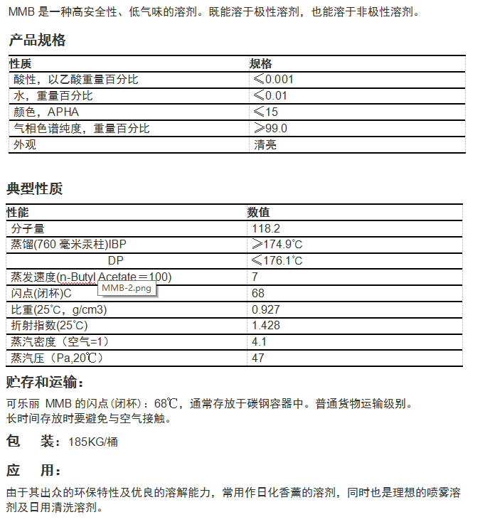 由于其独特的溶解性、挥发性、稳定性和清洁性能,<MMB>可用于家用空气清新剂和清洁剂、工业涂料和印刷化学品等。它还是环氧乙烷基和环氧丙烷基乙二醇醚的替代品。<MMB-AC>(3-甲氧基-3-甲基-1-丁基乙)也被广泛应用。
