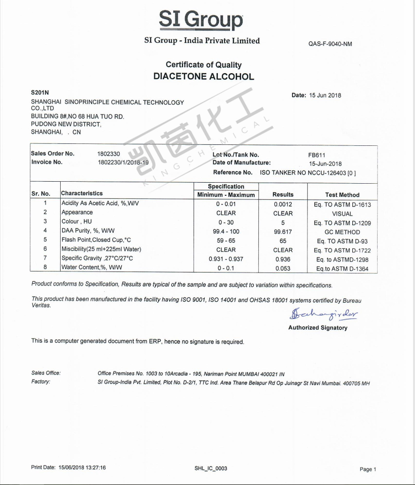 产品特性:双丙酮醇具有化学性质、醇和酮双丙酮醇作为一种高沸点溶剂对许多染料在纺织印染行业。它也有助于从印刷胶辊上除去油墨。这是一种很好的碳氢化合物分离溶剂。