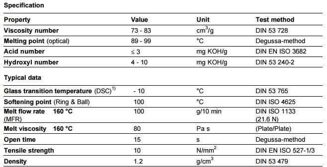 应用特性:德固赛共聚聚酯树脂 Dynacoll S1402是带端羟基的中分子量线性共聚聚酯。
