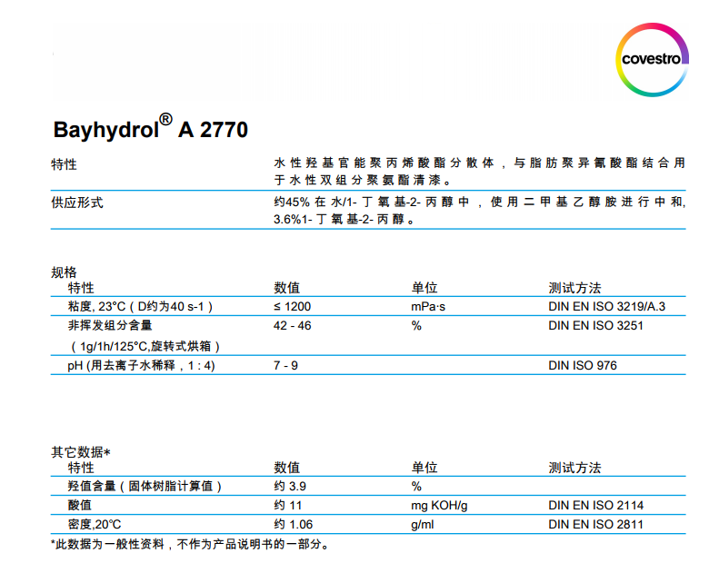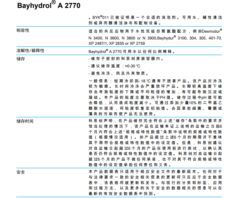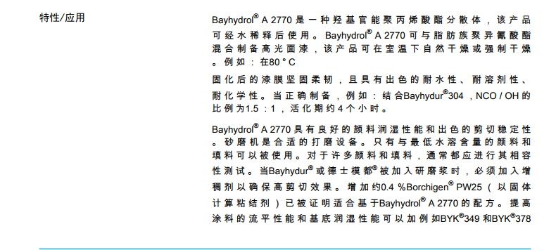 产品型号科思创(原 )水性聚氨酯Bayhydrol A XP 2770