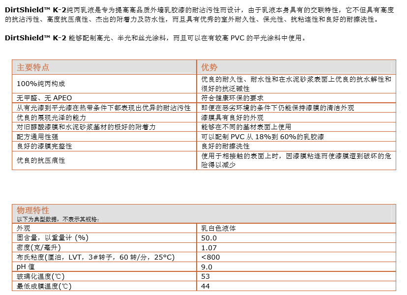 DirtShield™ K-2纯丙乳液是专为提高高品质外墙乳胶漆的耐沾污性而设计,由于乳液本身具有的交联特性,它不但具有高度的抗沾污性、高度抗压痕性、杰出的附着力及防水性,而且具有优秀的室外耐久性、保光性、抗粘连性和良好的耐擦洗性。