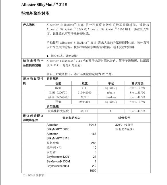 种高度支链化的羟基聚酯树脂。设计与Albester Si lkyMatt3225或 Albester Silky Matt3600用于一步法低光饰面,该体系也可用于热转印体系独使用