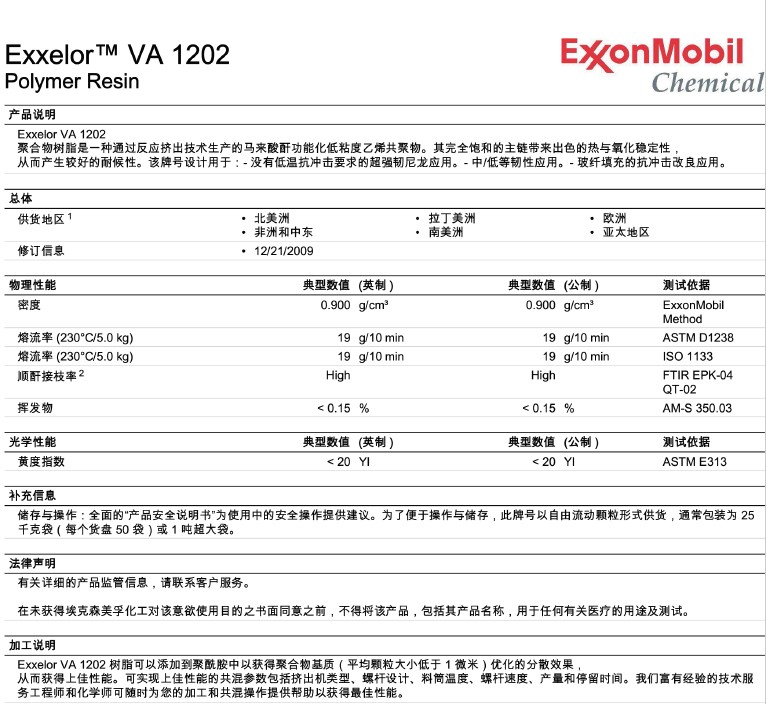埃克森美孚马来酸酐接枝物ExxelorTM 具有低气味、低黄变指数、高接枝率以及良好的批次稳定性。具体应用不同,效果可能不同,需要根据实际应用测试。
