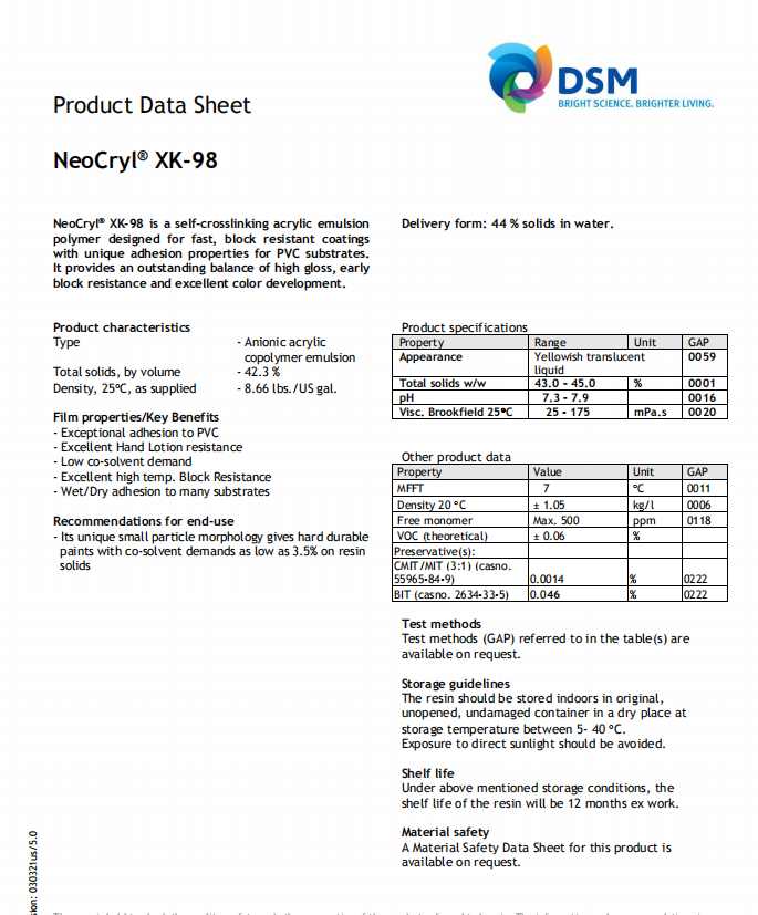 产品型号DSM帝斯曼水性丙烯酸树脂Neocryl XK-98