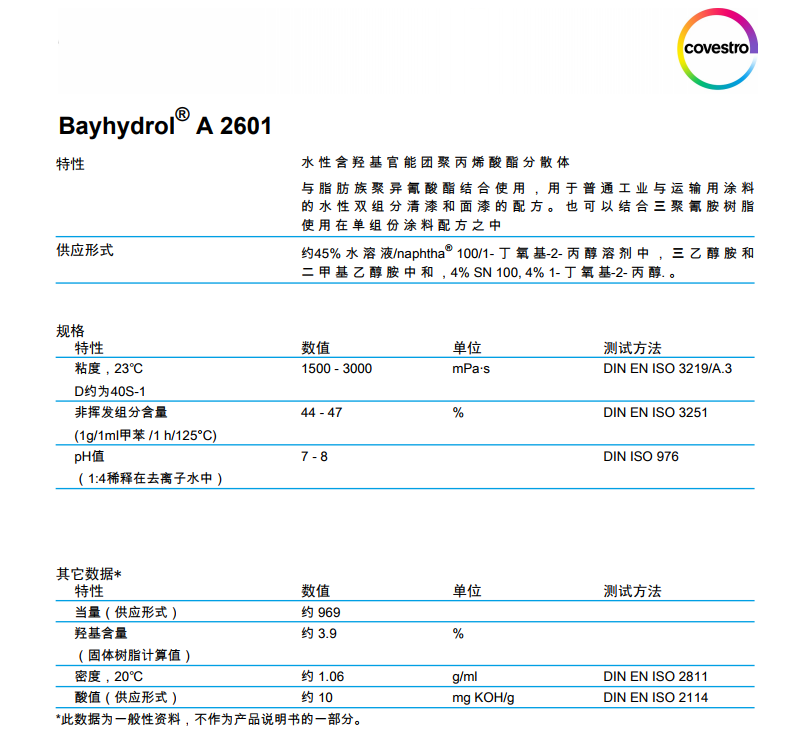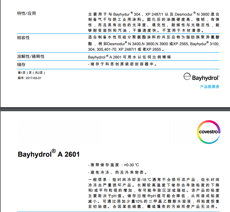产品型号科思创(原 )水性聚氨酯树脂Bayhydrol A 2601