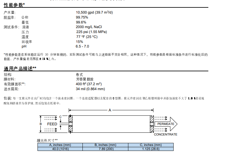 • 产品型号美国海德能 增强型抗污染反渗透膜 PROC10