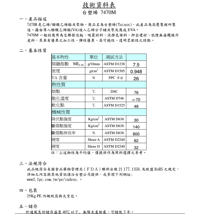 产品型号台塑乙烯醋酸乙烯酯共聚物EVA 7470M