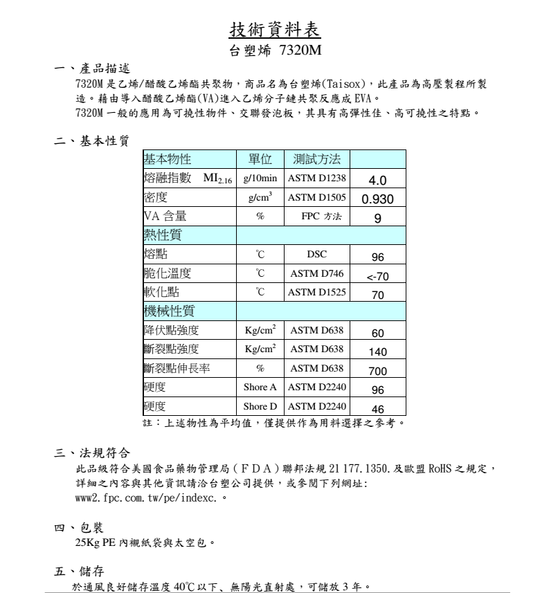 产品型号台塑乙烯醋酸乙烯酯共聚物EVA 7320M