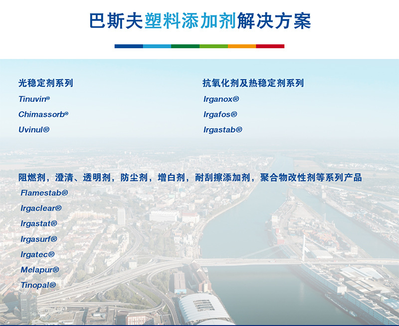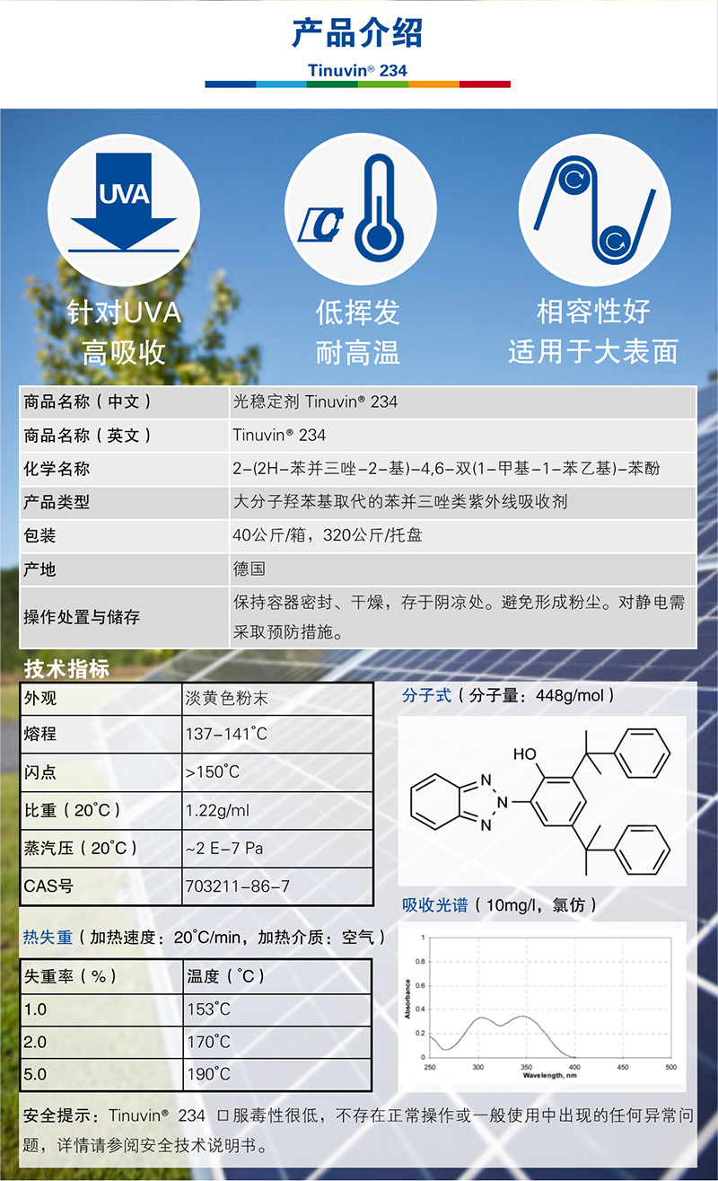 基本特性:Basf巴斯夫光稳定剂TINUVIN 234是高分子量羟苯基苯并三唑类紫外吸收剂,对大量的聚合物有着优异的光稳定性。
