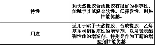 聚酯增塑剂广泛用于耐油电缆,输气管,防水卷材,人造革,鞋材,高温金属包覆层,水箱密封条,各种设备(包括制冷设备和汽车)的垫片和嵌件 ; 室内装饰; 电工胶带; 耐油的特殊产品,例如汽油。