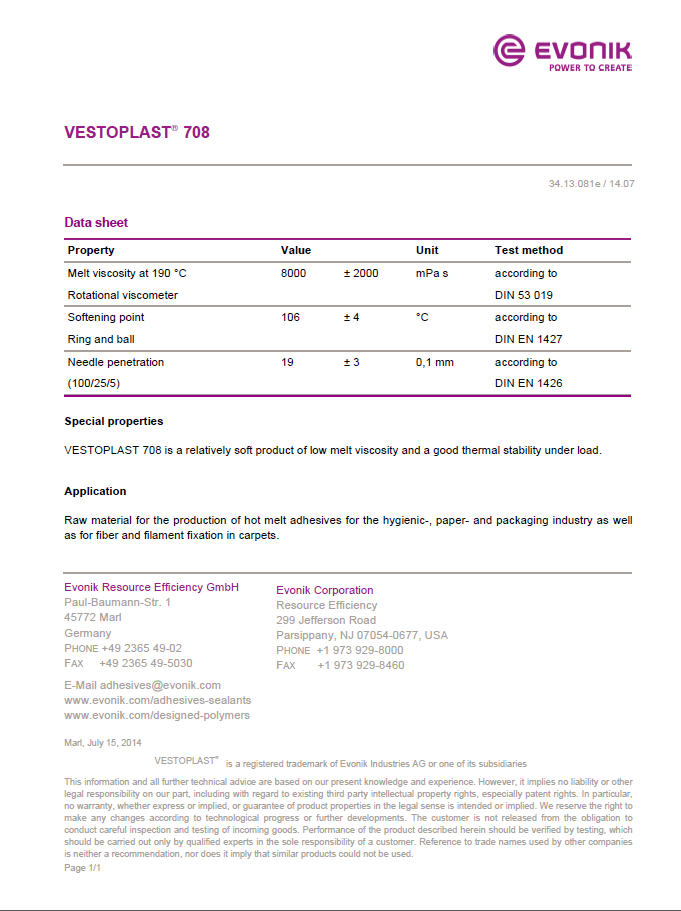 产品型号德固赛无定型聚烯烃VESTOPLAST 708