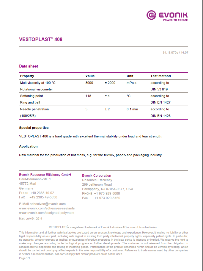 产品型号德固赛无定型聚烯烃VESTOPLAST 408