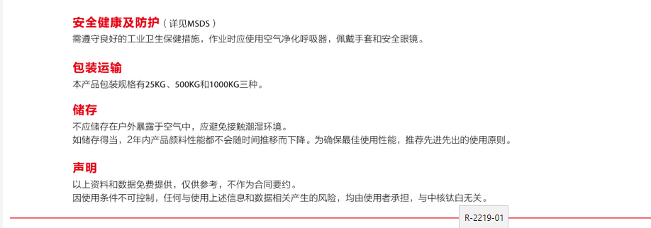 钛白粉是采用优良的表面处理和预分散工艺。将二氧化钛粒子界面形成完整和强韧的界面膜包敷,通过增大粉末化力和空间传阻的方式,大大减少粒子的团聚。将二氧化钛粒子达到预定所需的粒径,而使产品质量达到优质性能。