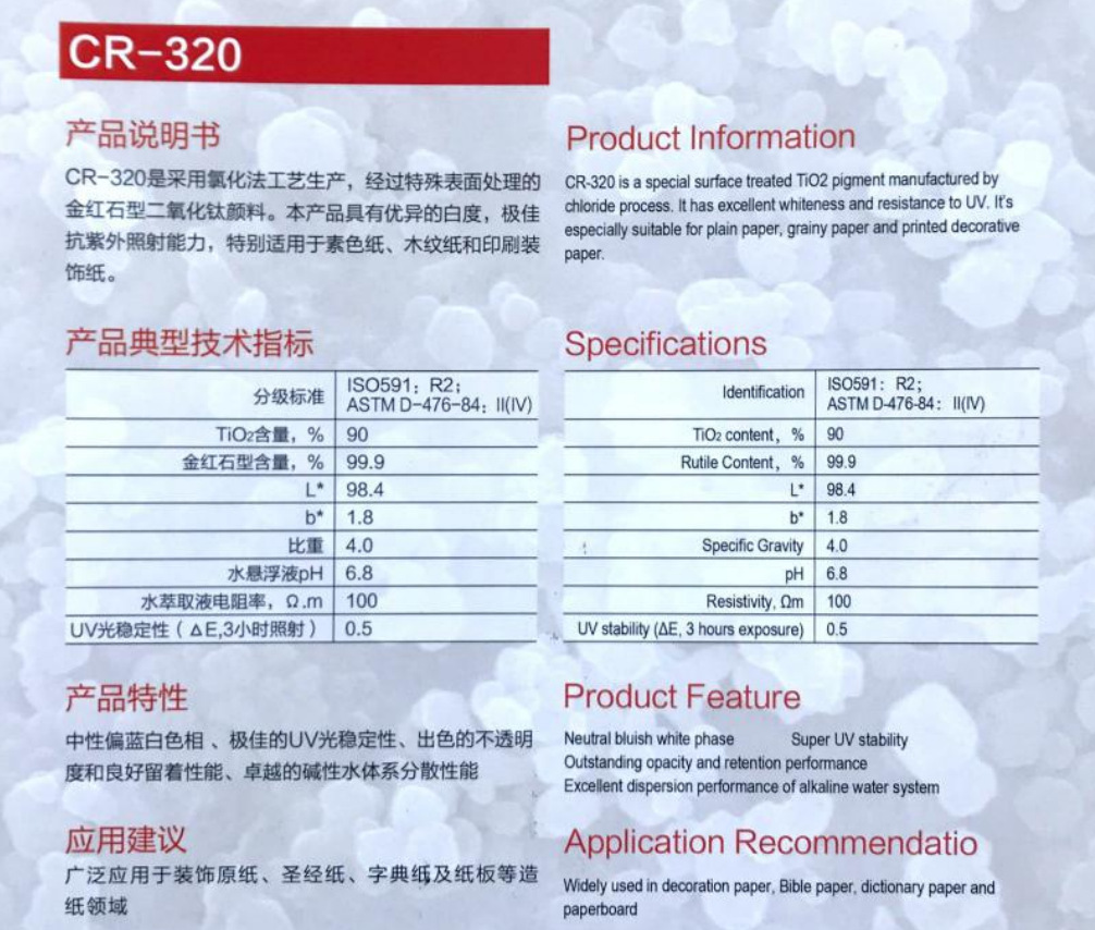 产品型号中信钛业 钛白粉CR-320 金红石型 木纹纸 印刷装饰纸用