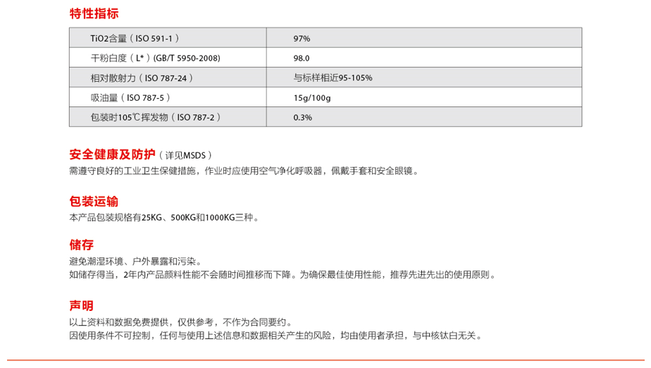 产品特性:中性色调、高遮盖力、高白度、较佳耐候性。应用建议:室内外平光、半光建筑涂料、一般工业涂料、装饰涂料,在水性应用体系中有更优异表现。圣经纸、一般装饰纸及纸板等造纸领域。安全、健康。凯茵化工供应的钛白粉产品是无毒的,如不慎大量吸入,应立即转移到空气新鲜场所;如眼睛接触了钛白粉,应立即使用大量清水冲洗;如有必要,请专业医护人员处置。产品包装:产品包装袋外层应用三合一纸塑复合纸,内层应用优等纸,每袋净重25kg。如客户有特殊要求,也可提供不同形式的包装。