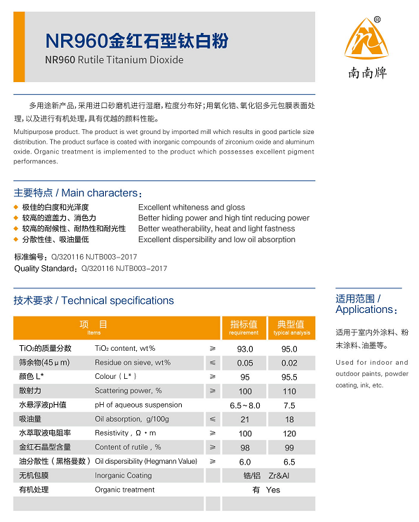 NR960多用途新产品,采用进口砂磨机进行湿磨,粒度分布好;用氧化锆、氧化铝等多元包膜表面处理,以及进行有机处理,具有优越的颜料性能。