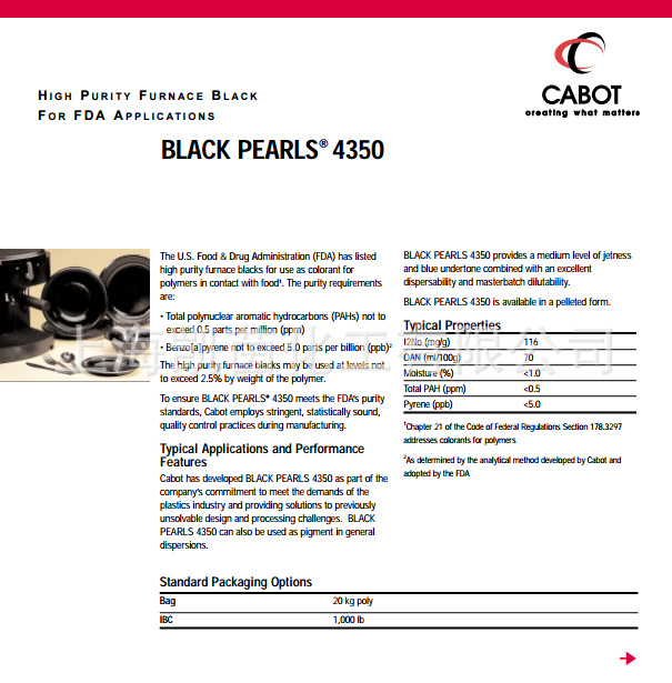 卡博特 碳黑Black Pearls 4350碳用途:高度纯净的碳黑,通关美国FDA认证,适合高环保要求或食品要求的涂料和油墨。凯茵化工代理各类 卡博特 炭黑。