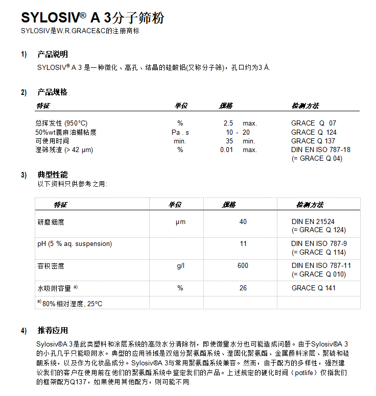 产品型号格雷斯除水剂 SYLOSIV A3分子筛粉