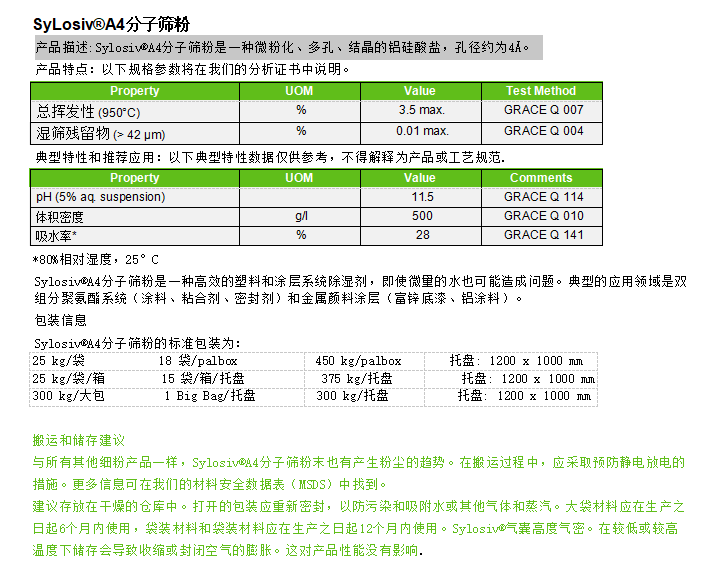 产品型号格雷斯除水剂 SYLOSIV A4分子筛粉
