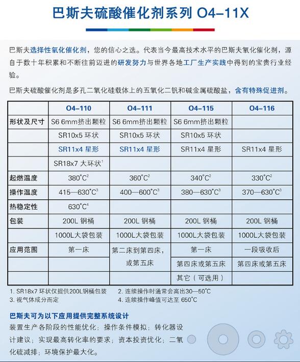 产品型号巴斯夫BASF硫酸生产用钒系催化剂CAT.O4-111特性氧化催化剂