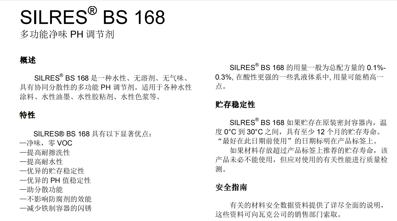 产品型号瓦克多功能净味 PH 调节剂SILRES® BS 168 瓦克168