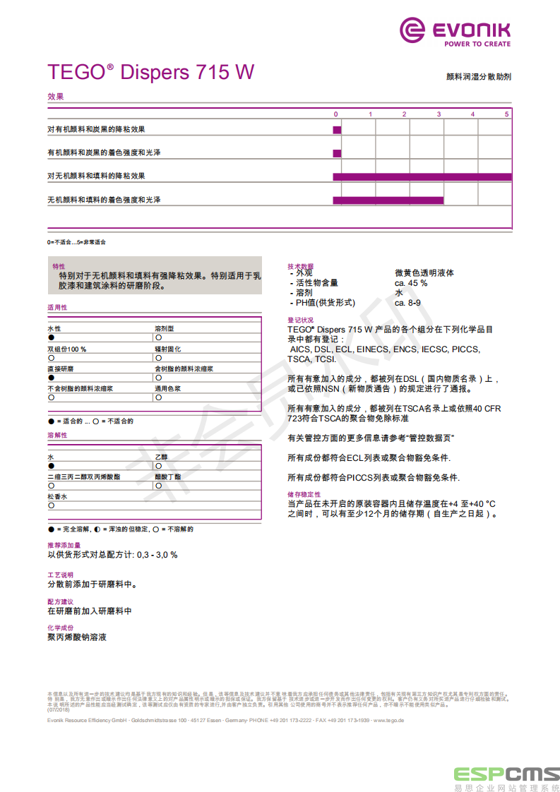 产品型号赢创迪高TEGO Dispers 715W水性体系分散剂