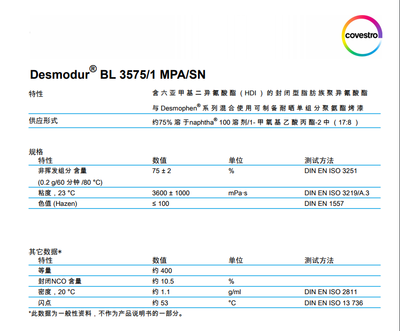 产品型号科思创(原 )固化剂Desmodur BL 3575-1 MPA SN