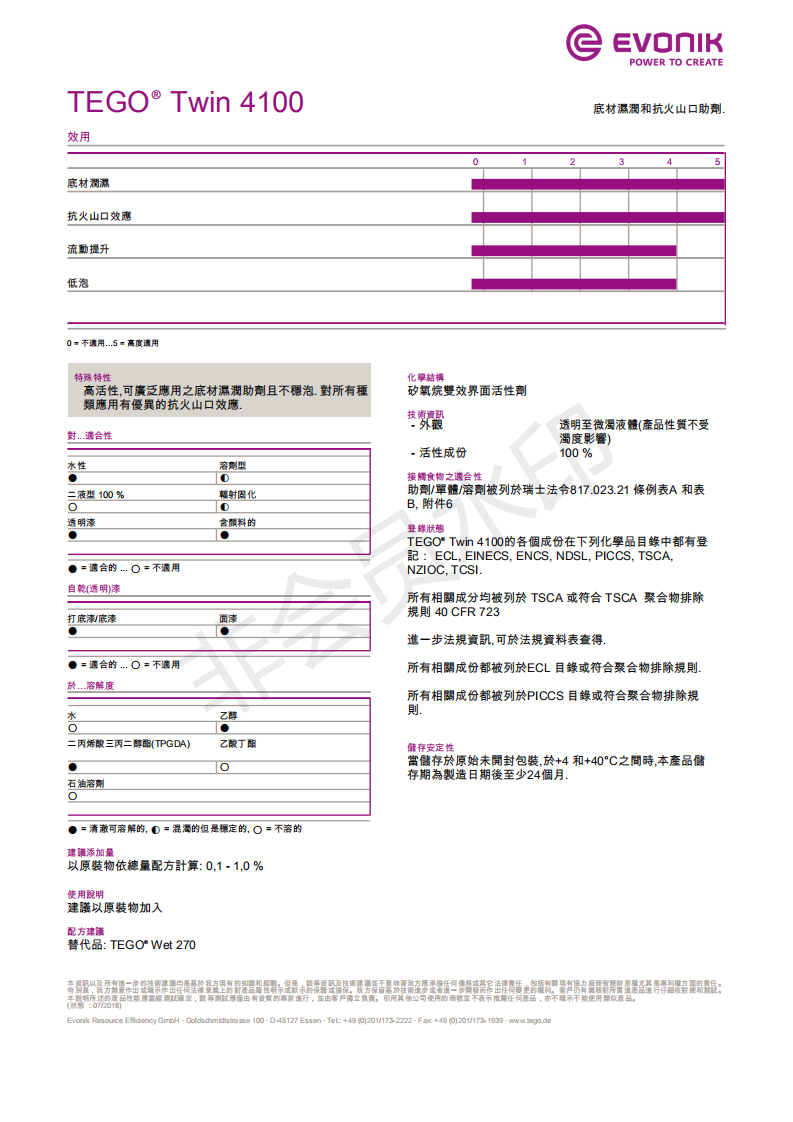 产品型号赢创迪高润湿剂TEGO Twin 4100底材濕潤和抗火山口助劑 原装正...