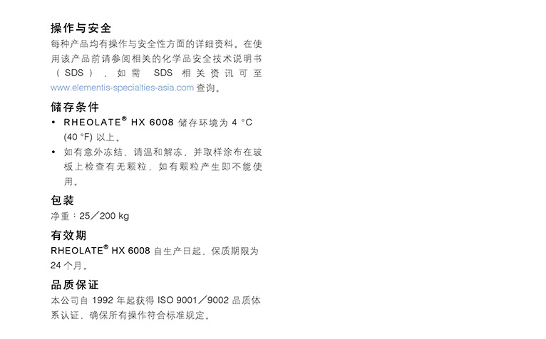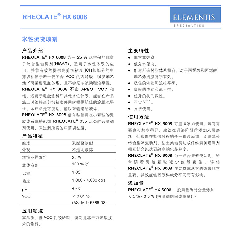 rheolate hx6008不含apeo、voc和锡,适用于乳胶涂料和其他水性体系,能够在产品施工时维持高剪切粘度并同时提供较佳的涂膜流平剂,本产品是可流动,能以泵输送的液体。