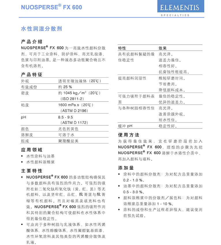 产品型号海明斯德谦润湿分散剂NUOSPERSE FX 600