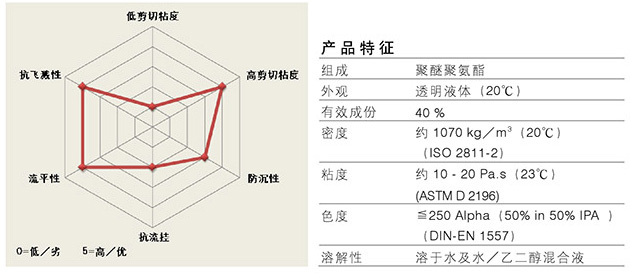 .属于缔合型聚氨酯类流变助剂.不同于第代流变助剂,可与高分子粘结剂粒子表面产生极强的结合力.即便是受高剪切力的作用.如在涂料的刷涂或滚涂应用过程中,这种相互作用都不会被破坏,独特的结构可避免坚固和致密的网状结构的形成,即使于无剪切力或低剪切力状况下亦是如此,因此对涂料的低剪切速率粘度与中剪切速率粘度影响很小